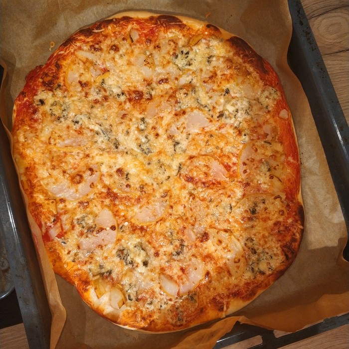 Изначально планировалась пицца 4 сыра, но в последний момент в голову пришла идея запихнуть к сырам грушу. Хорошо, что идея пришла, ибо пицца получилась офигенная. Короче просто смазала тесто томатной пастой, слегка посолила, выложила грушу, кстати, лучше взять спелую, сладкую, чтоб она на контрасте с сыром сделала свое дело. Ну а грушу уже обильно посыпала смесью 4х сыров, в моем случае это были дор блю+пармезан+гауда+козий сыр.