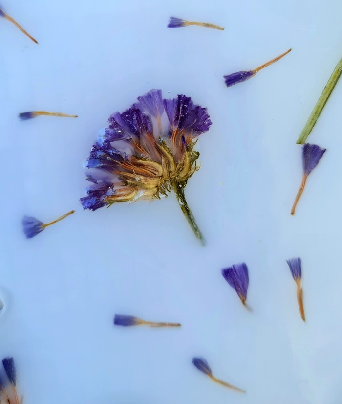 Допустим, вы купили готовые сухоцветы. Заливаете их в смолу и вокруг них образовывается размытое цветное пятно - смола забрала в себя краску. Работа испорчена.