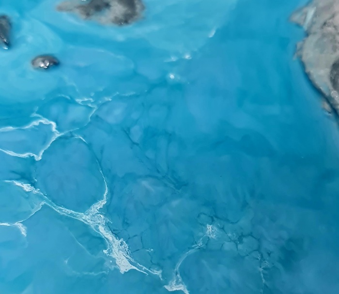 Тут на фото уже есть белая пена. Делается она не как морская, нам не нужны красивые разводы и ячейки. Используем белый алкогольный колер для смолы. Чтобы не переборщить, а это ох как просто, мажем им кончик палочки для смешивания или зубочистку и касаемся глади смолы. Получаются тонкие полосы, которые за счет содержания спирта, сильно не смешиваются со смолой и всплывают наверх. Чтобы придать им завихрений, берем коктейльную трубочку и дуем через нее на белые линии. Получается как на фото выше.