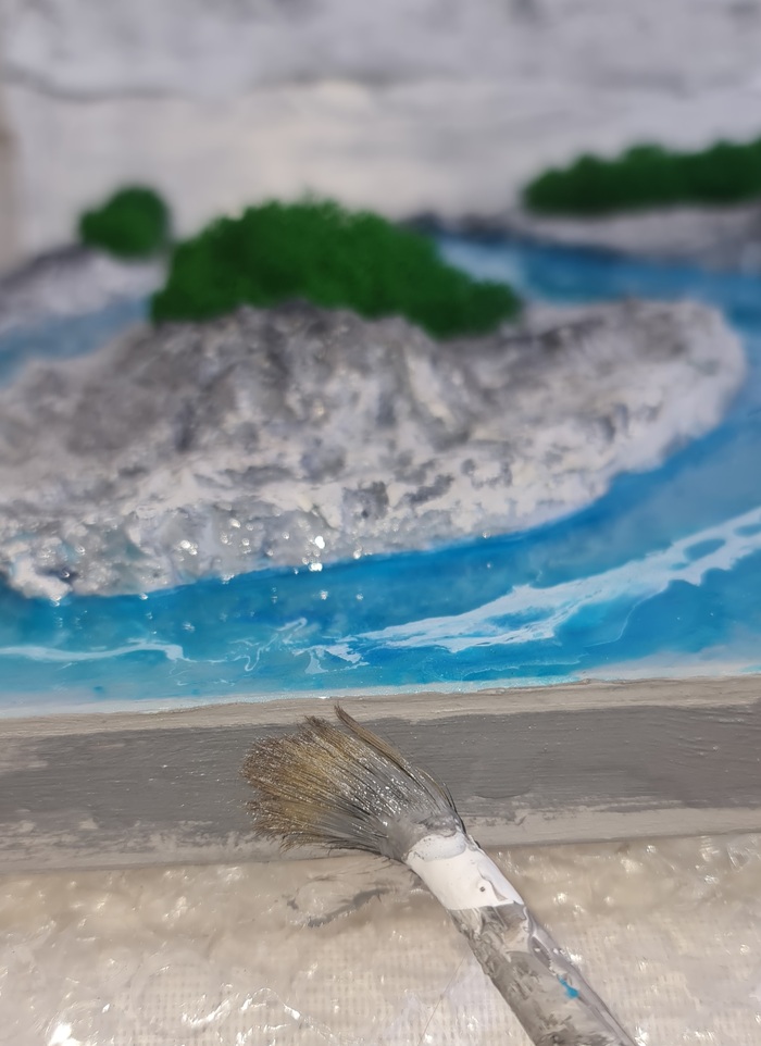 Получился монохромный пейзаж, а то, что отломалось от скал в процессе отклеивания от пленки, доводим надфилем до естественной формы и тоже окрашиваем. Приклеивать мелкие скалы не обязательно смола и так их удержит. Но это по желанию. Тут я приклеила все сразу.