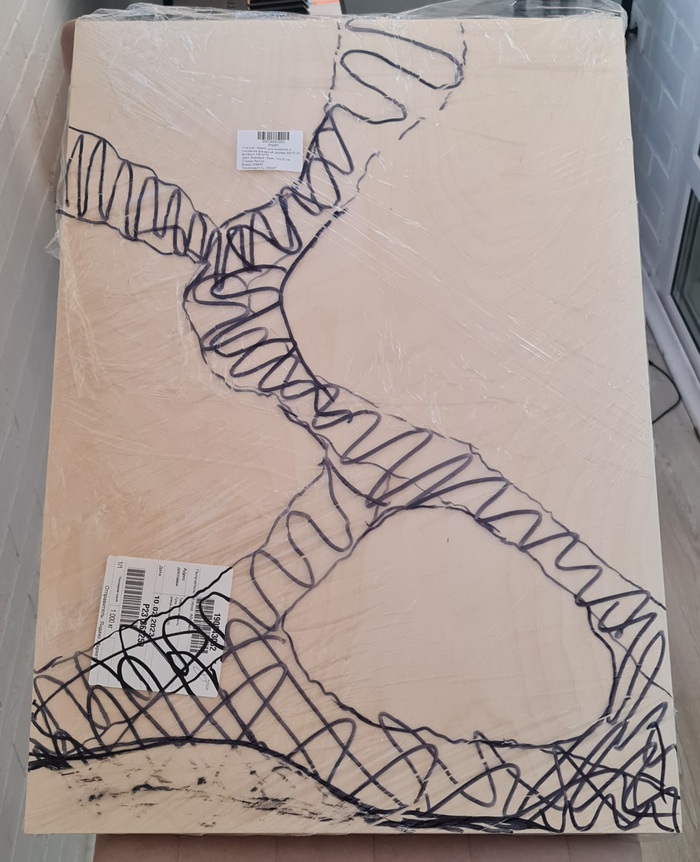 А это значит идём в распил за фанерой. Но я решила не ехать через полцарства в Леруа, а заказала на маркетплейсе за недорого "планшет для творчества" - та же фанера, только на аккуратном подрамнике по отличной цене. Поскольку картина будет очень тяжелой, это огромный плюс - будет куда вкрутить саморезы подлиннее для надежного крепежа. Не "раздевая" заготовку, рисую маркером примерный будущий контур картины и согласовываю его с заказчиком.