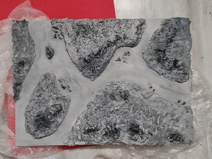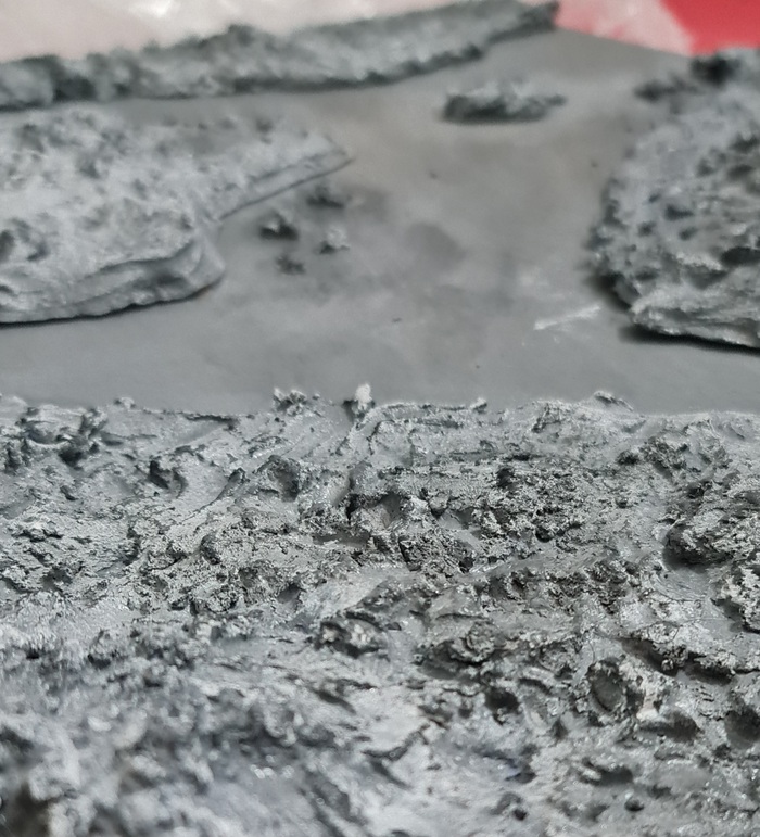 Далее, "выращиваем" скалы. Я пробовала много разных материалов для скал - текстурную пасту (что-то на богатом), шпаклёвку по дереву, бетонную шпаклевку, штукатурку, (хорошо до плиточного клея не дошла) и впринципе можно было бы и остановиться, но однажды мне были нужны малюсенькие скалы для подноса в стиле моря, а ничего из перечисленного не было дома, кроме плиточной затирки. И да, это получились самые прочные и текстурные скалы. Значит идем в ближайший строительный и покупаем 2 кг самой дешёвой затирки серого цвета. Замешиваем раствор погуще и делаем скалы. Рельеф стараемся делать по разнообразнее, это всетаки горы)