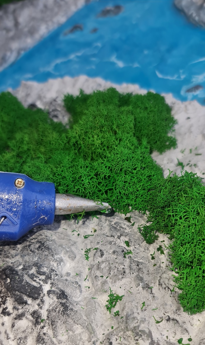 Пока торцы и смола продолжают сохнуть, приклеиваем стабилизированный мох горячим пистолетом