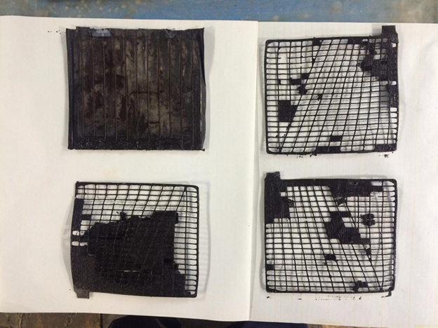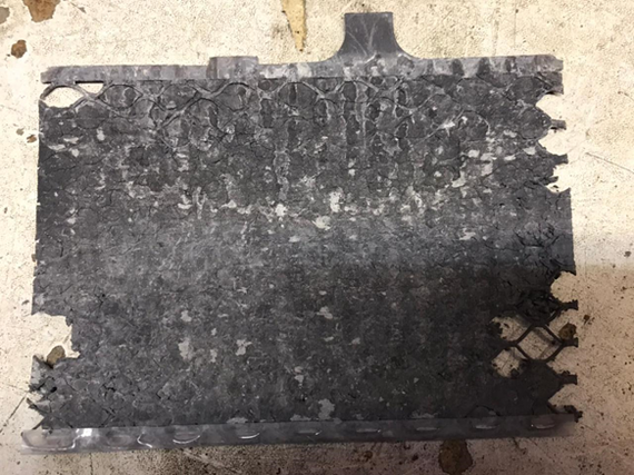 Вот так выглядят разряженные пластины. Белёсые участки — это сульфат свинца в виде кристаллов, которые уже не участвуют в электрохимической реакции разряда.