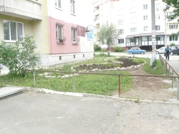 Через газон была тропинка и, видимо, сильно она раздражала жильцов. Собрались неравнодушные и решили сделать КЛУМБУ! Камни ещё с осени завезли, как только потеплело - выложили кромки и завезли чернозем, красота!