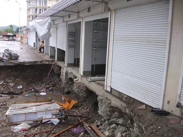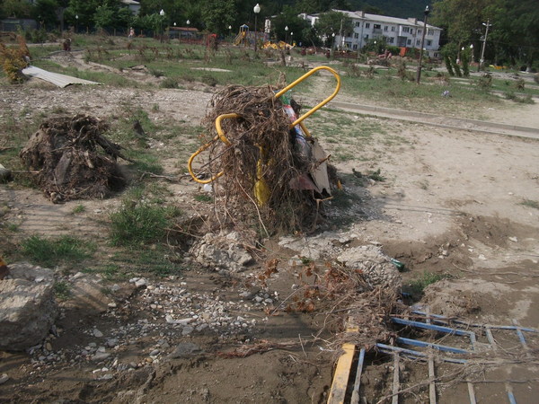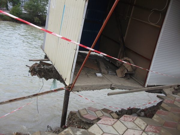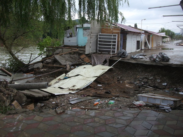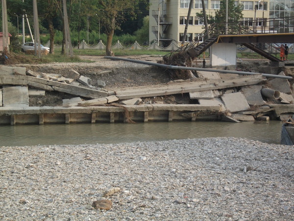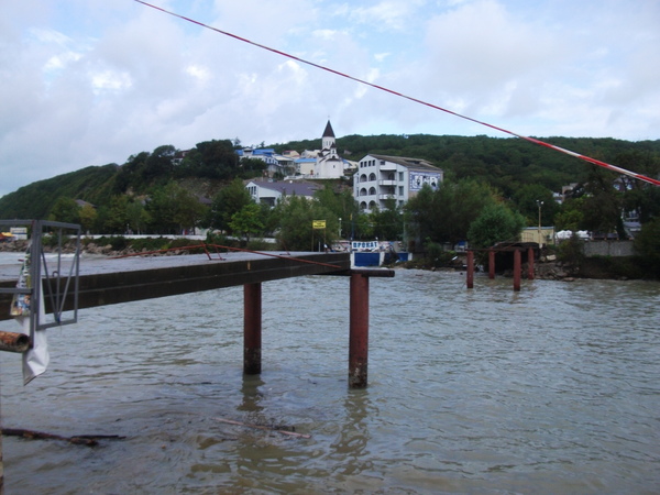 В два часа ночи отметка уровня воды поднялась на 6 метров от обычной и возвышалась над защитными конструкциями на уровне человеческого роста. Бурный смывающий поток несся с такой скоростью что, находясь в нем по колено, было практически невозможно устоять на ногах. Вода сносила все : каменные блоки и мосты, железные конструкции, заборы, автомобили, автоматы с игрушками и едой, лавки частников с сувенирами у моря(потом ещё недели 2 ходили ребятки с металлоискателями по берегу и испытывали судьбу).В некоторых местах образовались ямы и глубокие впадины. Во всех домах, стоящих в радиусе 50 метров от реки был полностью затоплен весь первый этаж. По одной из версий виновником был смерч, который «стоял» недалеко в море и своим присутствием создавал бурю над эти поселком. В это время волны на море, достигавшие 5 метровой высоты, обрушивались на берег смывая навесы, лежаки , зонты и уносили все в море.