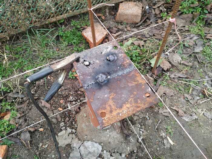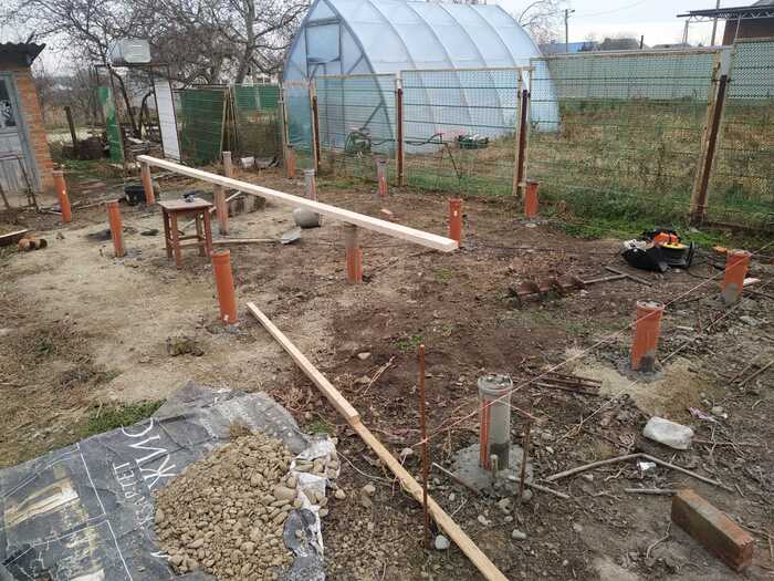 В качестве фундамента решил использовать бетонные столбы, армированные арматурой. Так как здание не сильно большое, то этого основания ему хватит с головой. Пробурил лунки на 70см, вставил в них канализационные трубы, в них арматуру, сваренную тройником и залил все бетоном. К краям арматуры приварил пластины для крепления обвязки.