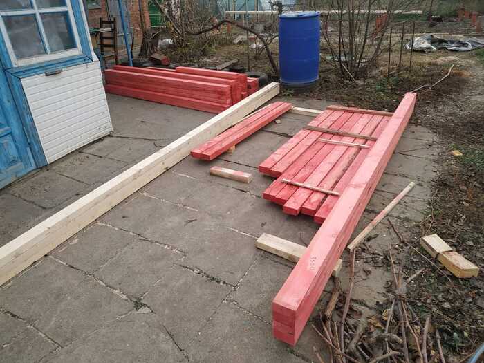 Ну тут два варианта по основному материалу - либо сухая, либо естественной влажности сосна. По причине урезанного финансирования была выбрана конечно естественной влажности. Профнастил купил некондиционный по 1,5 метра длиной, дверь и окно б/у, леса вышло чуть больше 2 кубов, 61 лист OSB и 10 кубов утеплителя. Расчеты все сохранил для определения конечной стоимости. Ну, соответственно расходники (гвозди, саморезы), пленки и обработка для древесины. Все это дело нарезал в размер и обработал защитой.