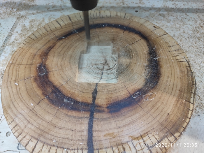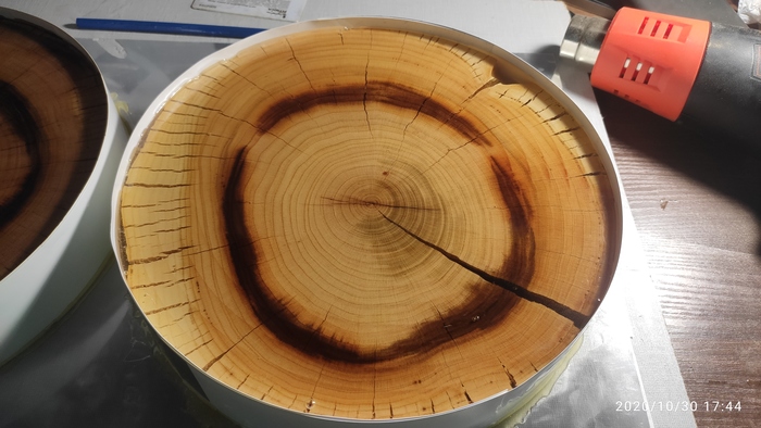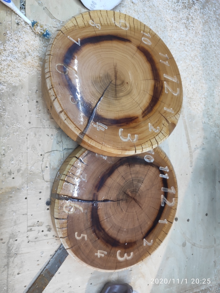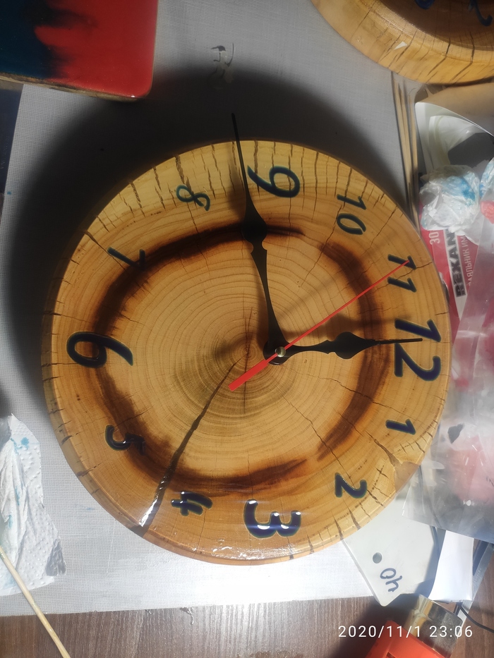 Было у меня 2 спила от абрикоса, высохли неравномерно, дали трещину и долго не знал куда мне их пристроить. Решил сделать часы, отфрезеровал, вырезал круг, толщина получилась 40 мм. Залил прозрачной смолой.