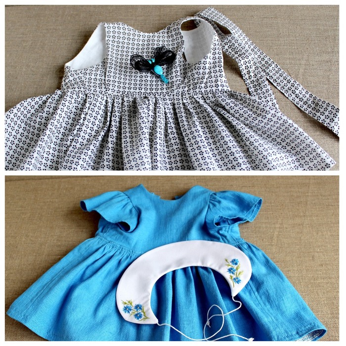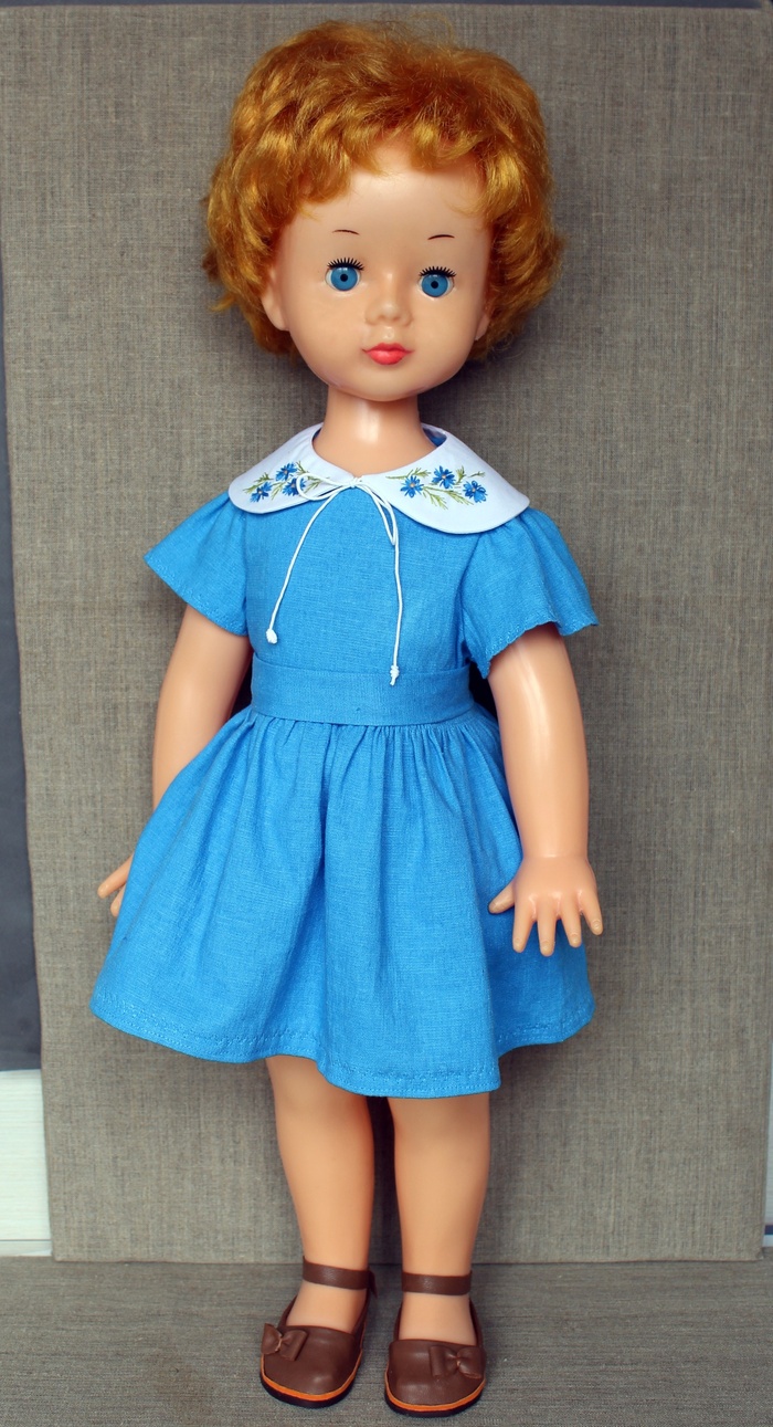 Платье сшила льняное, к нему - съёмный воротничок. Васильки вышила нитками мулине. Туфельки сделала из кожи.