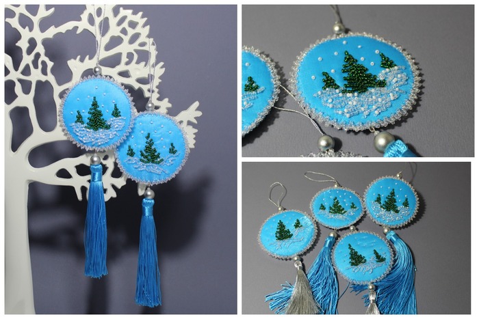 И ещё подвески. Говорят, зелёный цвет в следующем году актуален? На самом деле на этом атласе цвета хвои хорошо смотрятся бисерные снежинки: