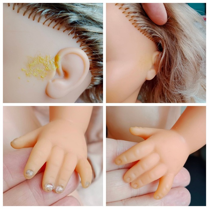 Лечение. Сначала, разумеется, куколку вымыла; волосы хорошие, но серые от пыли и спутанные, - бальзам мне в помощь. Долго и нудно пришлось удалять какую-то затвердевшую субстанцию (жвачку?) с лица и волос. С остатками маникюра и педикюра справилась легко)