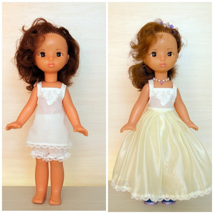 Мне куколка досталась "голая и босая", а вот из фабрики она выходила в таком наряде