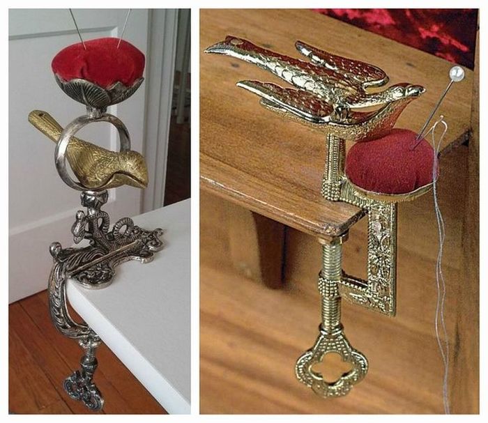 При шитье креплю обычной струбциной к столу, в остальное время просто стоит на полке в качестве игольницы.