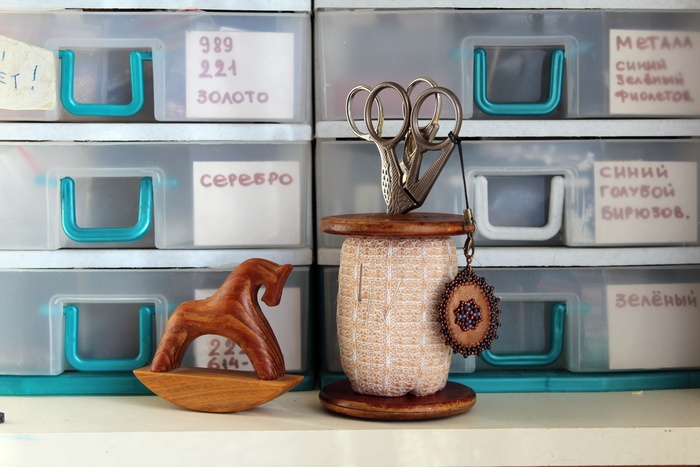 Заодно покажу ещё одну самопальную игольницу. Сделала из из большой деревянной катушки, подаренной мне много лет назад древней старушкой. Храню как память. А катушка хранит ножницы)