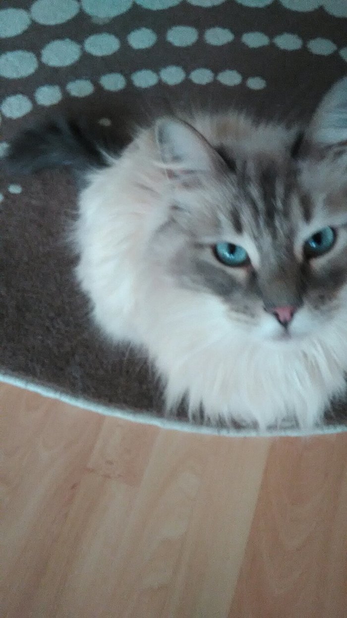 Дома уже проживали два братца кота. Вновь прибывшего сын назвал Валентином, даже не знаю почему, зовем его Валек. Так вот, Валентин оказался невский маскарадный кастрат, ему около 4х лет. От глистов полечили, в весе набрал, глаз вылечен, шерсть прекрасная. Жрал первые месяцы не в себя, потом блевал - видимо так голод сказался, сейчас тоже пытается переесть, но я препятствую.