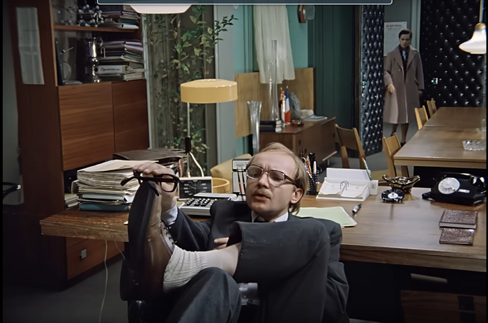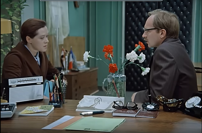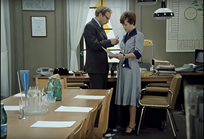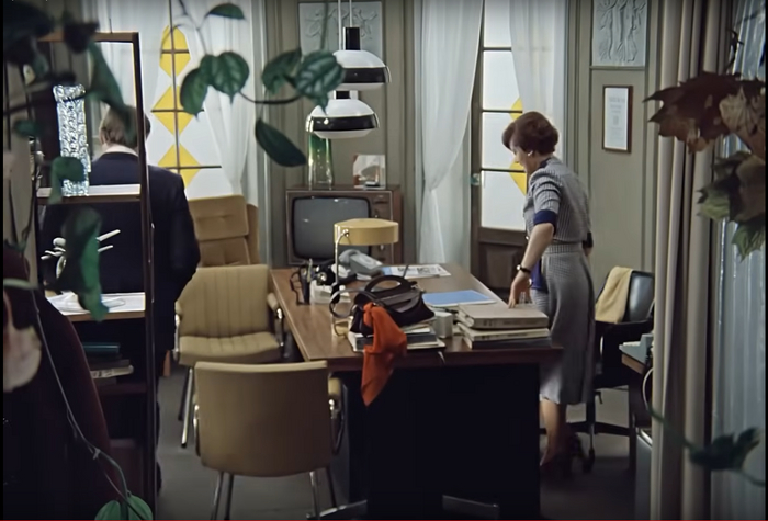 Теперь посмотрим на кабинет Калугиной. Стильные желтые витражи на окнах, белые шторы, кремовые стулья-кресла, которые и в современном интерьере смотрелись бы уместно. Кроме этого, в кабинете у Людмилы Прокофьевны поставили редчайший венгерский компьютер Videoton-340. Он стоил почти 440 тыс. рублей (для сравнения — «Жигули» можно было купить за 5 тыс. рублей). Сотрудник Центрального статистического управления ежедневно привозил компьютер на съемки, а вечером забирал. Его мельком можно видеть в различных сценах. Во всех смыслах статусная женщина. Так к чему было преображение?