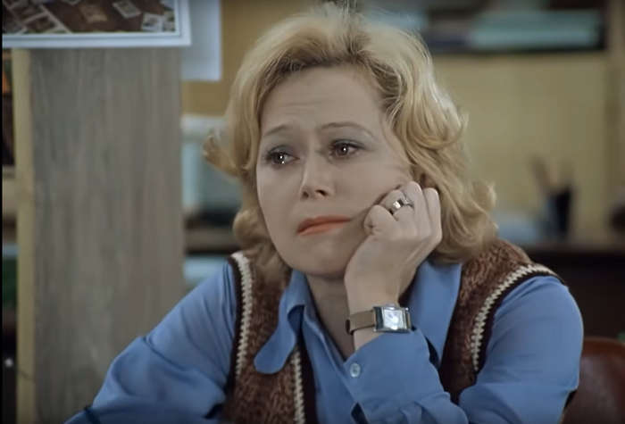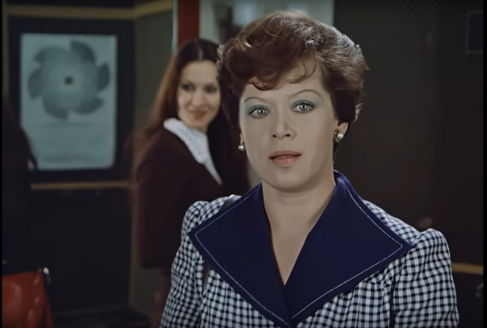 Но давайте всмотримся в личность Калугиной внимательнее. Начнем с внешнего вида. Как я уже сказала, Людмила Прокофьевна одета сообразно своему положению – строго и просто. Она – первый герой, которого описывают и показывают в кадре. Когда Калугина снимает пальто в своем кабинете, видно уместный строгий темно-коричневый костюм, светло-голубую блузку.