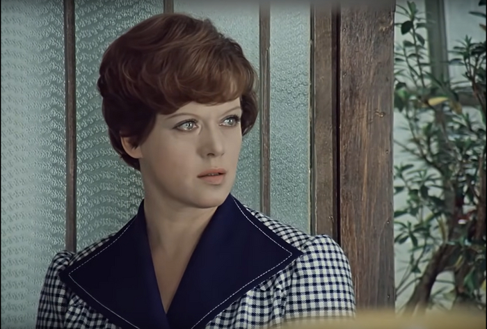 Сама Калугина, меняется, конечно, тоже – но при этом самый красивый ее образ мы видим не в момент преображения, когда она легкомысленно заходит в учреждение с мечтательным влюбленным взглядом, а ближе к концу, когда она берет себя в руки, возвращаясь к своей роли начальницы, но уже в новом облике внешне. Сравните.