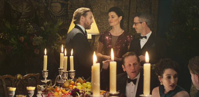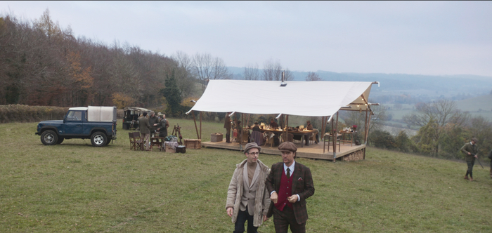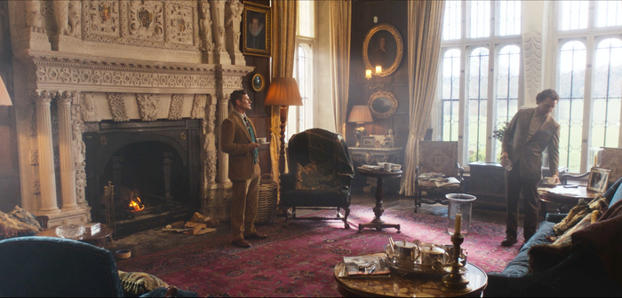 О какой-то конкретной цветовой гамме говорить не приходится, все, что сразу бросается в глаза и задает фильму тон – обилие чисто традиционных британских мелочей. Например, в первой сцене главный герой заказывает пиво и традиционную английскую закуску к нему – маринованное яйцо, ставит пластинку и садится у камина. Даже сенсорный телефон не выбивается из картинки – сцена снята так, что в руке у героя просто черный кирпич без вида иконок экрана. Деловые переговоры проходят либо за столом при свечах, либо в обстановке традиционных развлечений британских аристократов – стендовой стрельбы (по глиняным тарелочкам), либо просто на фоне древних особняков.