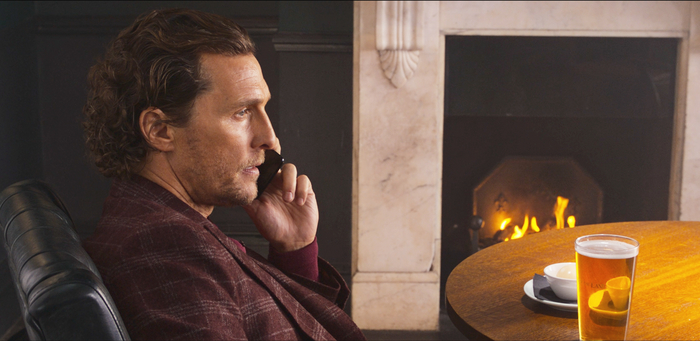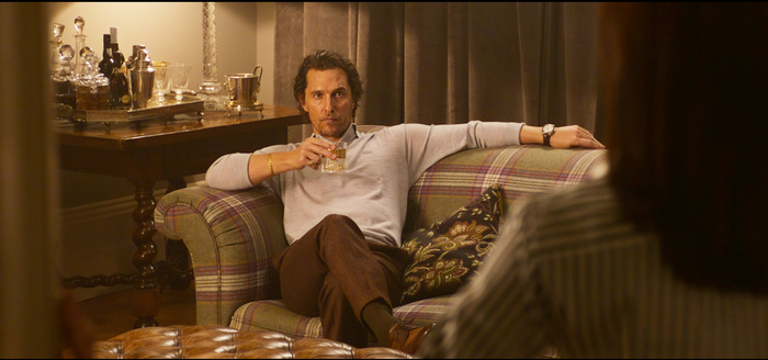 Этот британский аристократический тон во многом держится за счет костюмов всех действующих лиц. На ютубе есть разбор фильма от ателье по пошиву мужской одежды, где подробно объясняют, почему персонажи носят те или иные вещи. Что касается главного героя и его близкого окружения – в кадре всегда будут рубашки, галстуки, пиджаки, кепи. Даже в расслабленной домашней атмосфере стиль Микки Пирсона не меняется – без пиджака, но в джемпере и брюках.