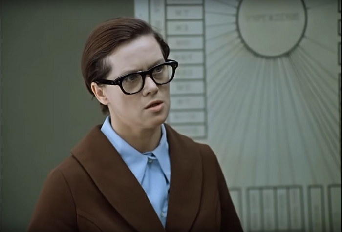 Калугина тоже не может позволить себе по должности одеться чересчур легкомысленно. В фильме упускается этот момент, на первый план выходит тот факт, что она не хочет, ей не до этого. А на фоне остальных руководителей она выделяется лишь прической. «Зализанные» назад волосы, пожалуй, единственное свидетельство небрежного отношения женщины к своему внешнему виду, укладка для руководителей все же не была чем-то нежелательным.