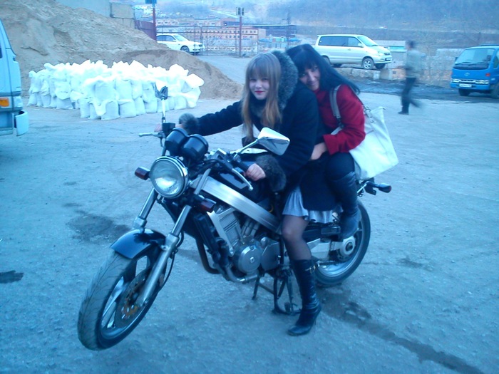 А вот и я с подругой на своем первом мотоцикле в день покупки. Это Хонда Бросс - верный пёс)