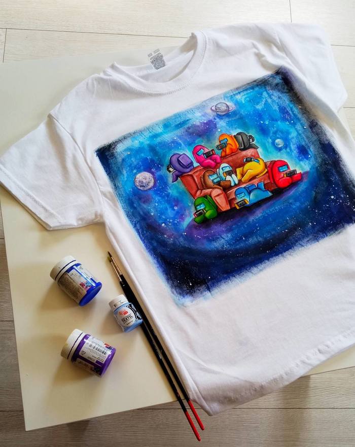 Искала сыну футболку в интернет-магазинах, ну вот приглянулась красная с принтом (кот с джойстиком). Показала малому, говорит: «Мама, ты же сама такое нарисуешь, зачем покупать эту». Так и сделали) Футболка хлопковая однотонная +картинка с интернета + свои поправки (диван, подушки, мелочовка) + акриловые краски для ткани +кисточки + вдохновение = получилась к лету обновка с ручной росписью.
