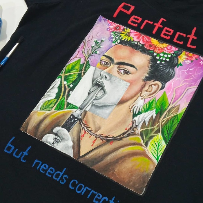 Моя Фрида. Роспись красками для ткани "Декола", а вот надпись - это объемные Pebeo. Последние наносятся, как и любые другие составы, но после проглаживания утюгом становятся выпуклыми, "мягкими" и бархатистыми. Картинку стырила у Пинтереста, внесла свои авторские коррекции.