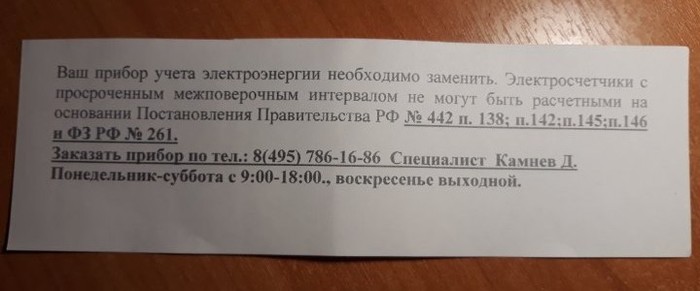 Для ЛЛ: ваш электросчётчик больше не электросчётчик, срочно его замените, а то у вас не примут ваши показания с него. Для того, чтоб вы нам поверили, вот вам ссылка на на какой-нибудь федеральный закон. А чтоб вы долго не раздумывали, вот вам номер, на который нужно срочно позвонить. Вперёд, на встречу приключениям!