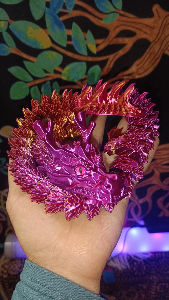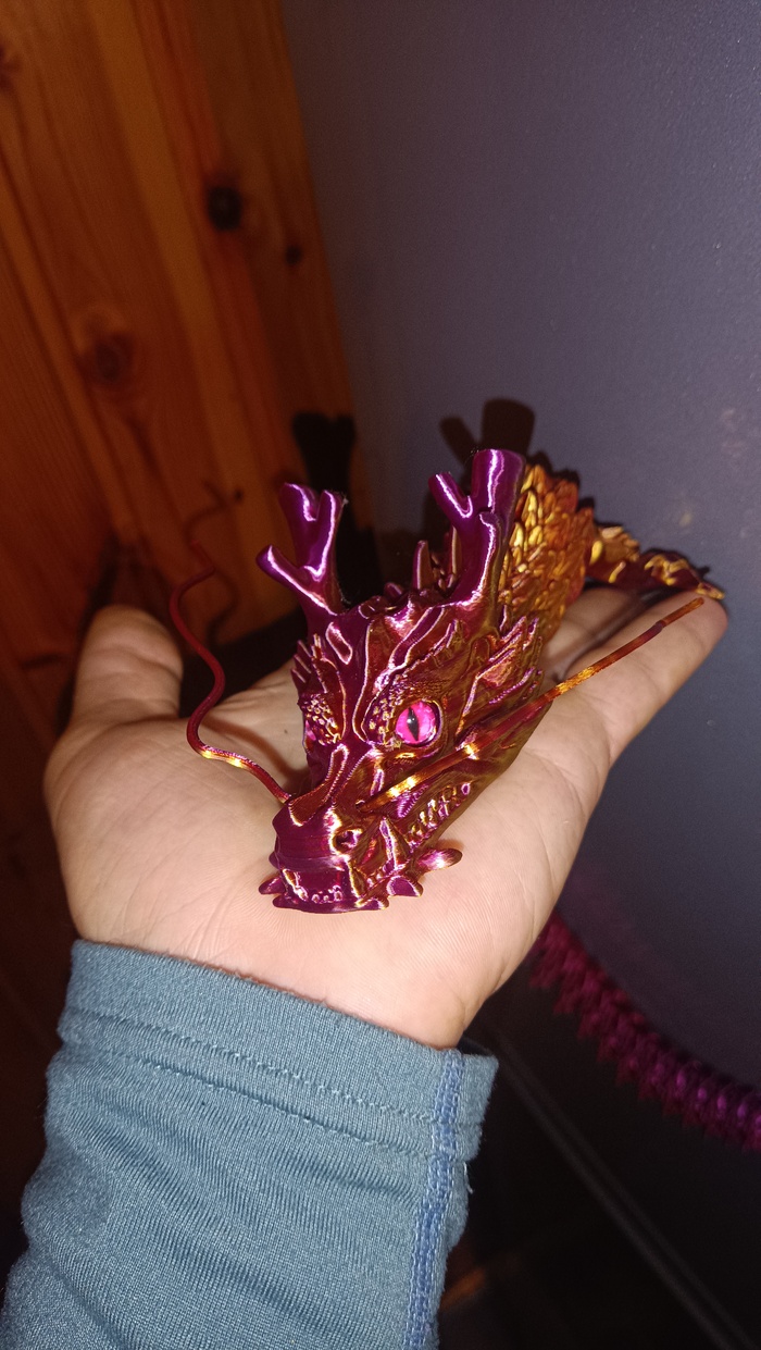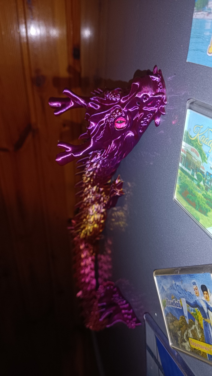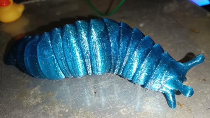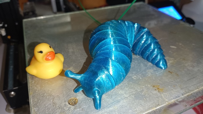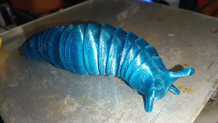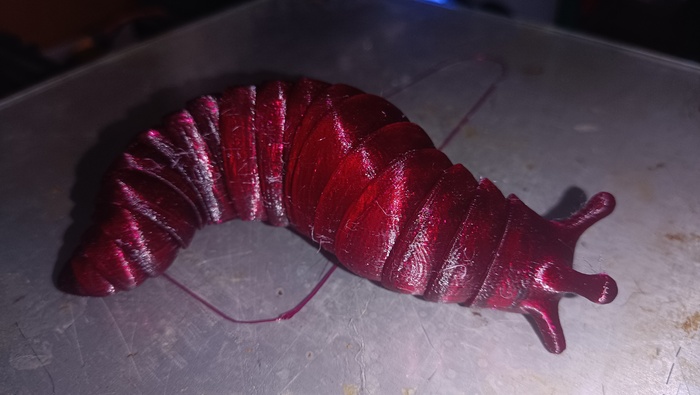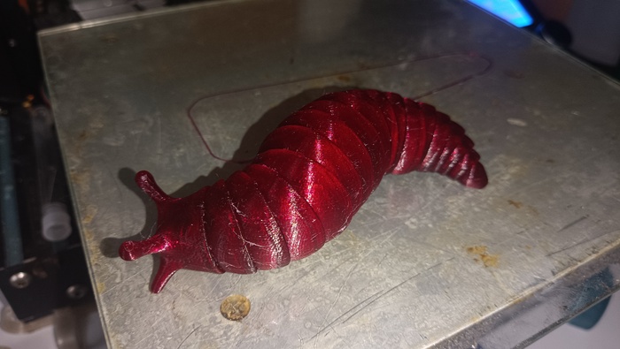 Привет, на днях ездил на велосипеде по точкам респауна пэт бутылок у себя в городе, залутал редкие малиново-красные бутылки, переработал и напечатал из них слизня, длинна 13 см