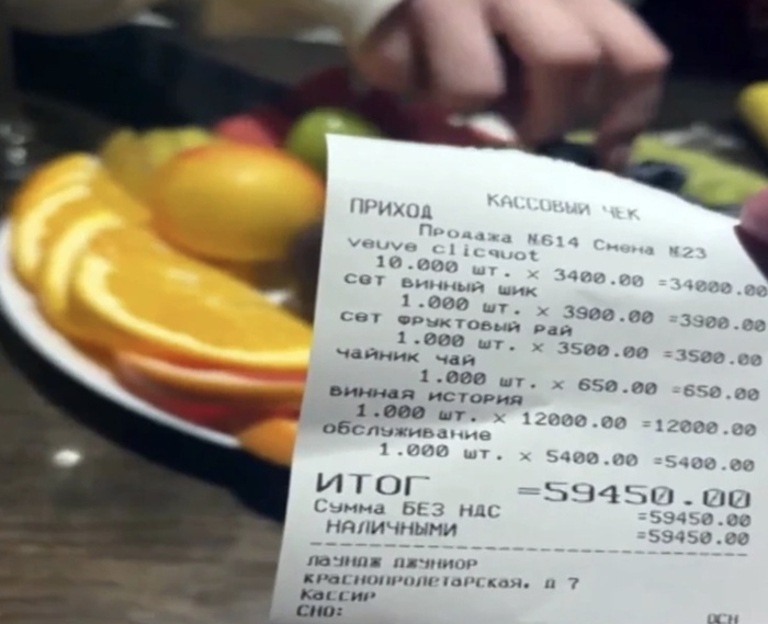 Чек - из одного очень интересного заведения на улице Софьи Ковалевской (север Москвы). В 12 тысяч рублей молодому человеку обошелся бокал шампанского «Вдова Клико» (6,1 тыс.), сырная тарелка (3,8 тыс.), пожухлый салат цезарь (1,2 тыс.) и стакан яблочного сока. Все, кроме сока заказала брюнетка, которую он в тот вечер первый раз в жизни видел.