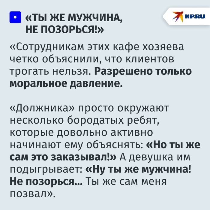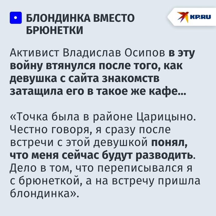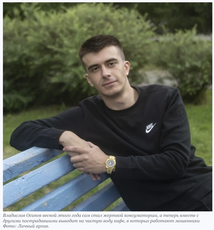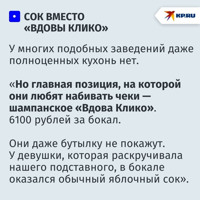 Кренделев объясняет: познакомился в интернете с девушкой, она пригласила на свидание и сказала, что знает одно очень уютное кафе… Парню повезло. В тот самый момент, когда он разглядывал квиток и лихорадочно соображал, как будет расплачиваться, в заведение нагрянула съемочная группа федерального канала с нарядом полиции. Оказалось, это кафе - известная точка, где работают консуматорши. Так называют девиц, которые заманивают доверчивых мужчин в нужное заведение, где им выставляют счета с ценами на уровне самых пафосных ресторанов центра Москвы.