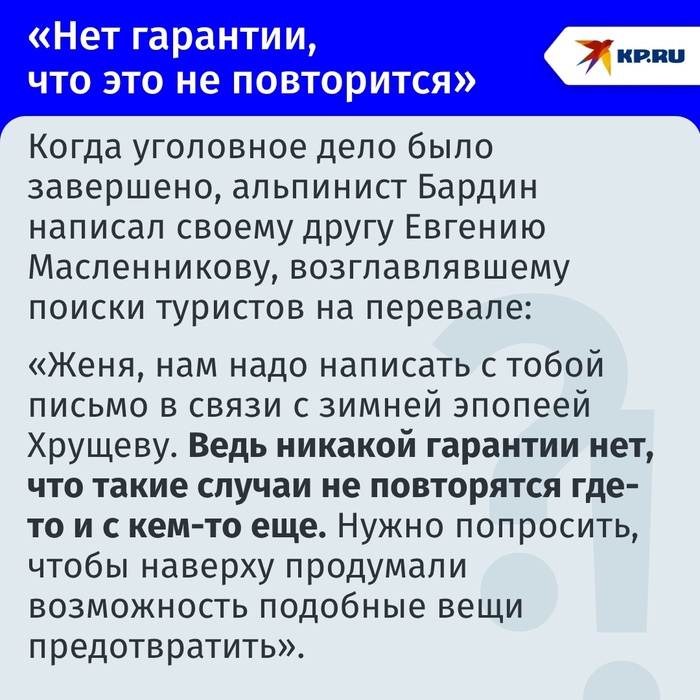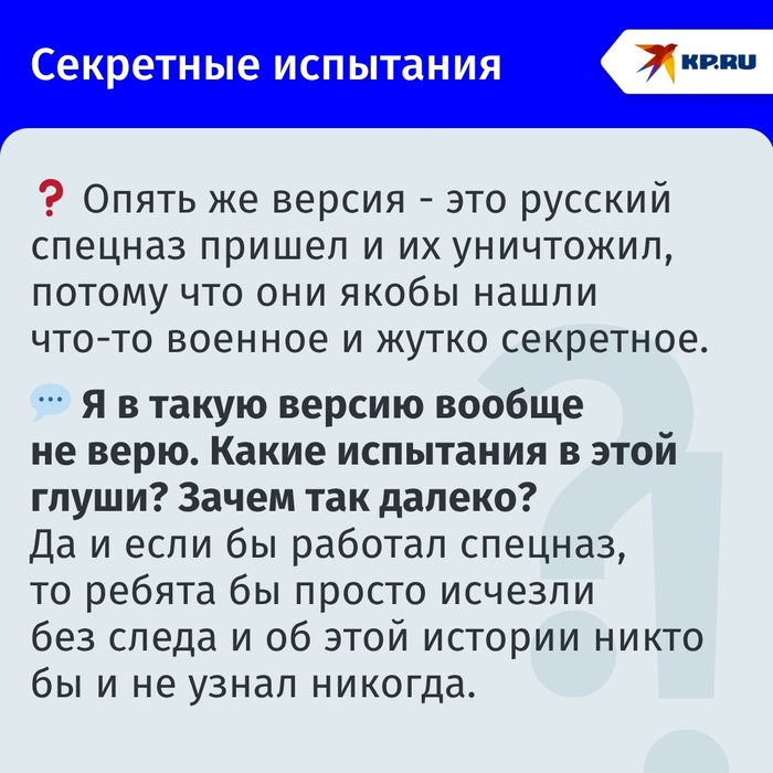 Как установило следствие, морозной и вьюжной ночью они в панике выскочили из палатки - полуразутые и полураздетые, преодолели по склону полтора километра, развели костер в безветренном месте… и погибли один за другим... Их искалеченные тела нашли только через несколько месяцев.