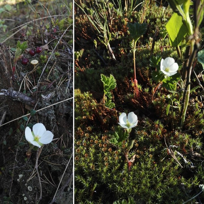 Так цветет морошка на фоне прошлогодней клюквы.