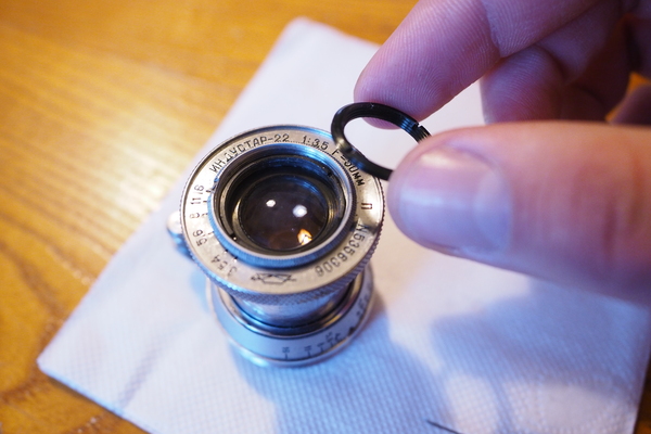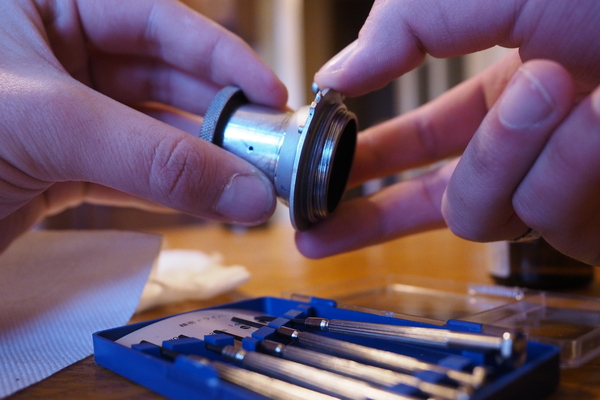 Теперь переходим к смазке. Для того, чтобы кольцо диафрагмы не барахлило, для начала следует снять верхнюю линзу и её крепёж, так как он нам и мешает смазать ходовую часть. Крепёж зачастую закручивается не так сильно - можно сдвинуть пальцами/ногтями. Но если не идёт - можно использовать обратную сторону штангель-циркуля, но будьте осторожны, так как он может оставить следы/вмятины, а если сорвётся рука - есть шанс поцарапать не только крепёж (металл очень мягкий), но и саму линзу. Достать новый линзоблок (которые выпускались для некоторых объективов на том же самом КМЗ) иногда бывает нереально, а доноры не всегда в лучшем состоянии. Так что будьте аккуратны.