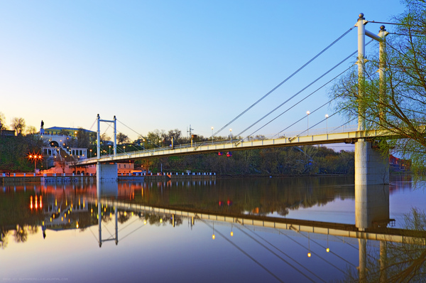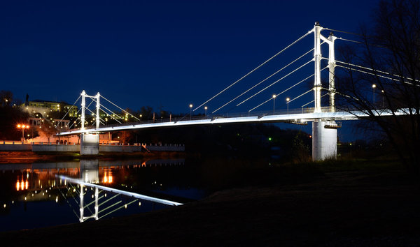 В ночное время суток подвесной пешеходный мост и набережная освещается многочисленными фонарями, делая одну из достопримечательностей города Оренбурга очень впечатляющей.