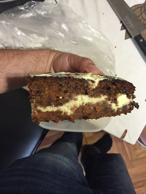 Пытался сделать морковный торт "типа как в старбакс". Красиво не получилось и вкус не совсем тот. Кусочек сразу же оттяпал себе, на завтра.