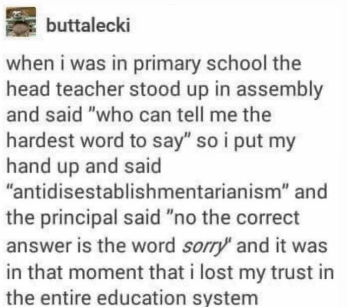 Когда я был в начальной школе, классный руководитель встал на собрании и спросил "кто мне может сказать самое сложное слово" ну я поднял руку и сказал "антидисестеблишментарианство" а директор выдал "нет, правильный ответ слово "прости" и вот это был тот момент, когда я потерял веру во всю систему образования.