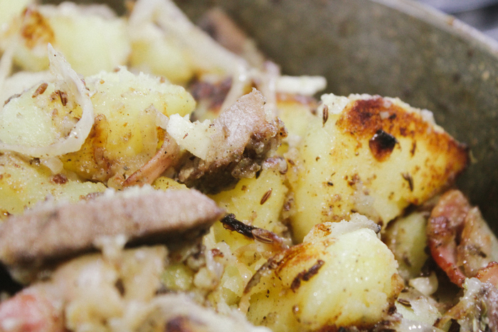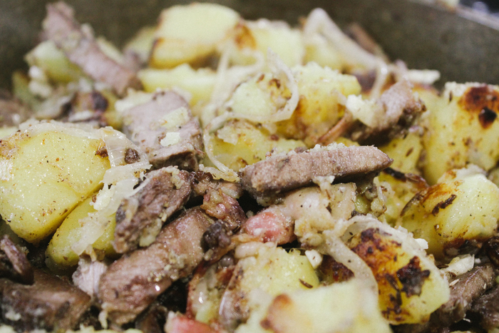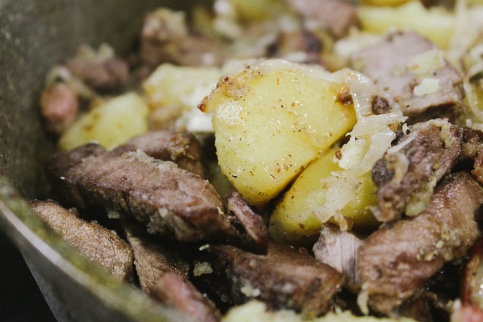 В общем, как только внешний вид блюда устраивает – румяность картофеля, поджаристость бекона, – я закидываю кусочки говядины, аккуратно, окончательно и бесповоротно перемешиваю блюдо, выключаю плиту и накрываю крышкой сковороду. Коровьи куски если чуть и остыли, то нагреются от соседства с другими ингредиентами.