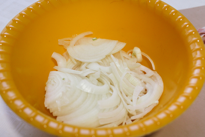Теперь нарезаю лук полукольцами. Допускается кольцами, кубиком, ромбами, искушенный гурман может бросить луковицу целиком. Также, нарезаю бекон прямоугольниками размером примерно со спичечный коробок (в идеале тот, что с балабановской спичечной фабрики).