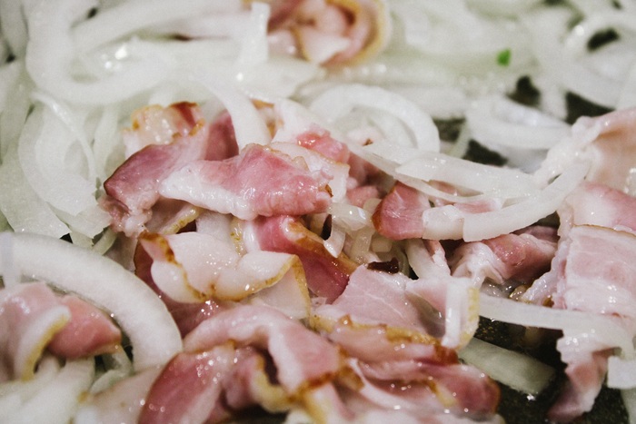 И в ту же сковороду, где обжаривал говядину, на сильный огонь забрасываю бекон и практически сразу же лук. Постоянно перемешиваю в течение 3-4 минут, чтобы лук стал полупрозрачным, а бекон в меру поджарился.