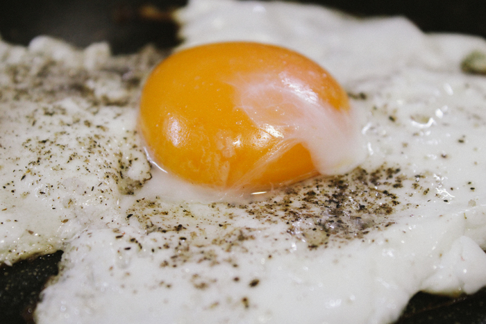 Отделил желток от белка, на сковороду добавляю немного масла и выливаю белок. Солю-перчу, запутать хочу. Минуты 3-4 жарю белок на медленном огне, под крышкой (можно и без нее, можно вообще яичницу приготовить так, как каждый любит сам). Затем добавляю желток, накрываю крышкой еще на минуту-полторы, и можно выкладывать порцию грёстля на тарелку, а поверх аккуратно глазунью. И зеленого лучка для аппетиту и чтобы глаз порадовать!