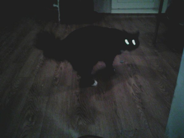 Подруга в отъезде. За котом слежу я. Решил отправить ей фото пухленького и милого котика её. Он в это время игрался с пивной крышечкой. Открыл камеру, навел на кота, и позвал: "Кеннииииии!!". А по опыту знаю, что в таких ситуациях он бросает мимолетные взгляды и сразу отворачивается. Поэтому после зова сразу жму на "снять". Вот итог: