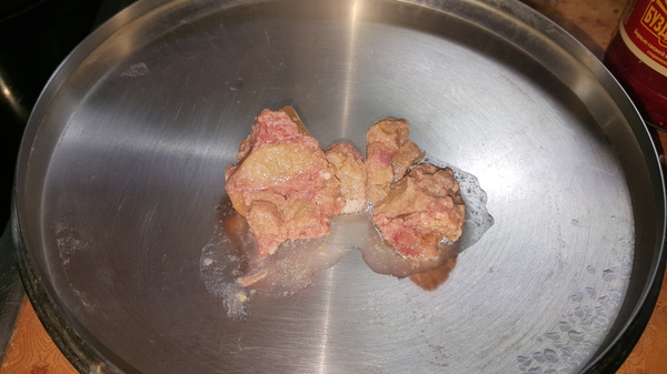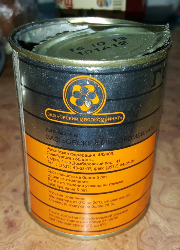 Поскольку содержимое первой банки из Орска я в макароны класть не решился, сходил в магазин и купил другую тушенку, на этот раз из города Курган. На первый взгляд, там оказалось мясо. Органолептическая проверка показала, что это действительно мясо. Кенгуру или даже страуса, которых забивали вместе с будками. Мясо напоминало по консистенции плохо пропущенный фарш, ощущаются частицы разваренных в автоклаве косточек. По осязанию как в рыбных консервах. Кризис. И тоже 115 рублей за баночку. Макароны я выбросил.
