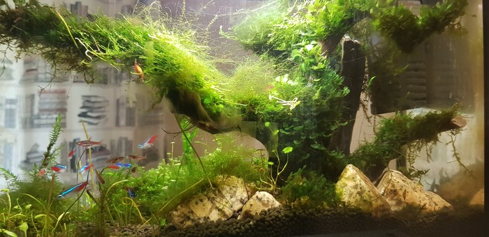 Теперь этот аквариум живет, хотя это уже третий его вариант. Когда то он собирался как хоспис для попугая, но после его смерти, пережив несколько апгрейдов, стал креветочником.