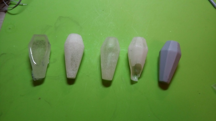Далее нужно было заменить более сложные детали на прозрачные. Обратился к другу, который работает с пластиком, тот дал мне немного такого, что при застывании становится прозрачным. Так я, с помощью силиконового герметика, кучи времени и мата сделал несколько попыток создать кристалл и врата монолита: