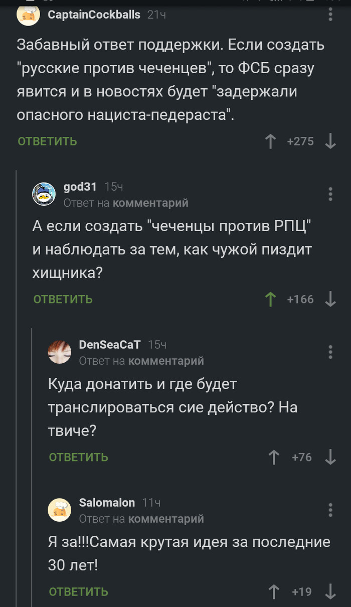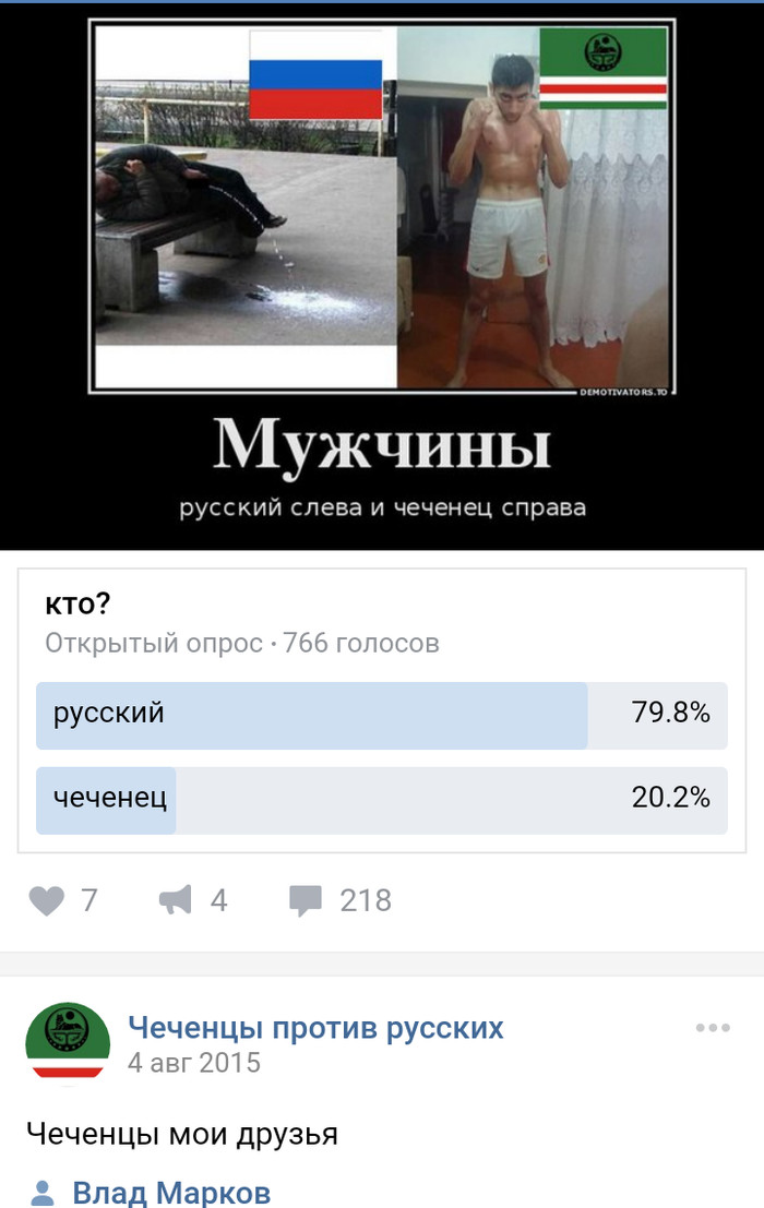 А мораль сей басни проста,что такие посты разжигают межнациональную рознь,неважно чеченец или русский увидев сей пост про оскорбление своего народа начинает подсознательно ненавидеть оппонента,запомните война начинается лишь тогда когда обе стороны уверены что они правы.