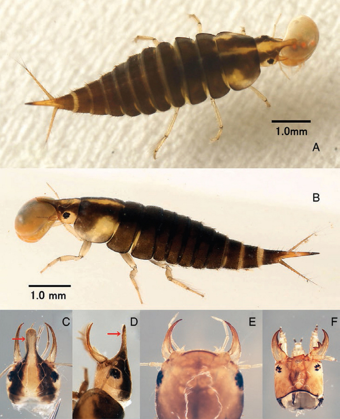 Ближайшие ныне живущие аналоги адских муравьев — личинка жука-плавунца Hyphydrus japonicus (A–D) и личинки водных жуков с обычным строением челюстей: плавунец Platambus optatus (E) и водолюб Enochrus simulans (F). Фото из статьи M. Hayashi, S.-Y. Ohba, 2018. Mouth morphology of the diving beetle Hyphydrus japonicas (Dytiscidae: Hydroporinae) is specialized for predation on seed shrimps