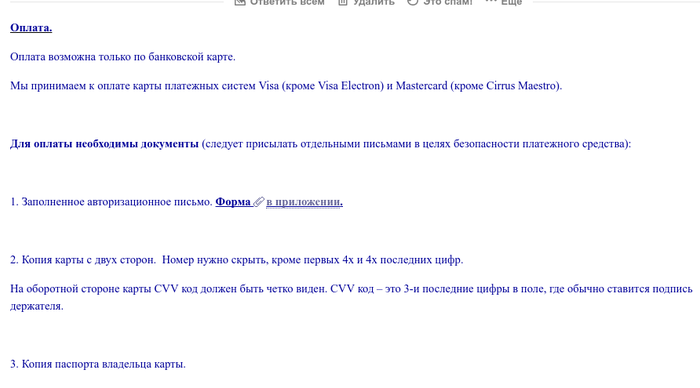 Для оплаты необходимы документы (следует присылать отдельными письмами в целях безопасности платежного средства):